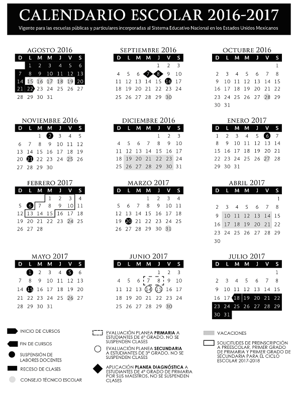 A través del Diario Oficial de la Federación, la SEP presentó los dos calendarios escolares para el ciclo 2016-2017, uno consistente en 200 días y otro de 185, para los niveles preescolar, primaria, secundaria, normal y demás para la formación de maestros de educación básica.