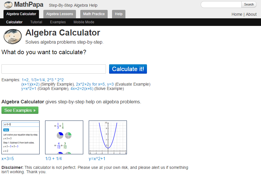 Es una página donde es posible encontrar soluciones a problemas exclusivamente de álgebra. Tiene una sección de teoría donde explica paso a paso cómo resolver ecuaciones de álgebra, aunque es en inglés. Pero al igual que las opciones anteriores tiene la característica de resolver expresiones en línea y mostrar el paso a paso de cómo se llegó al resultado que presenta.