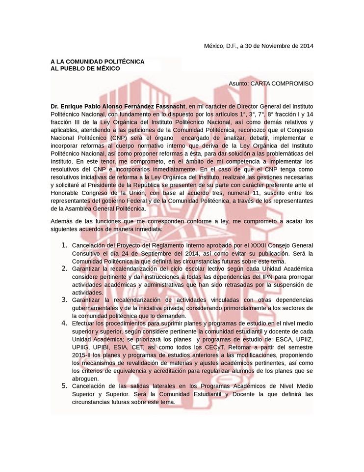 Luego de siete días de la suspensión del diálogo con las autoridades gubernamentales y tras acordar la carta compromiso que habrá de firmar el nuevo director del Instituto Politécnico Nacional (IPN), Enrique Fernández Fassnacht, los estudiantes politécnicos, en paro desde hace 63 días, decidieron retomar el diálogo el próximo martes 2 de diciembre a las 15: 00 horas en el Auditorio Alejo Peralta.