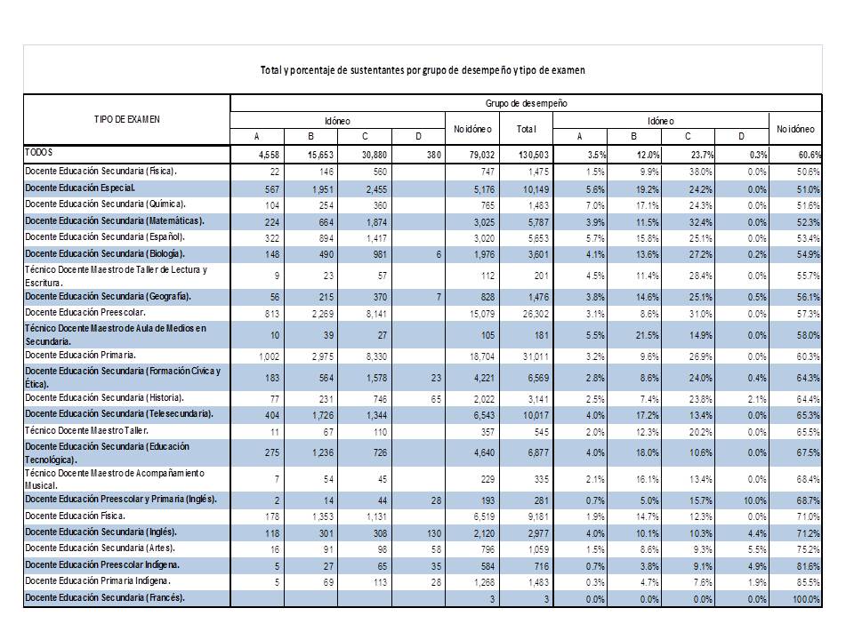 Ni el INEE, ni la Secretaría de Educación Pública (SEP), han detallado hasta ahora cual fue el resultado de los maestros que presentaron el examen y están en servicio, lo que sí se ha dicho, es que aquellos que hayan obtenido un nivel de desempeño “no idóneo”, no podrán seguir dando clases en el servicio público.