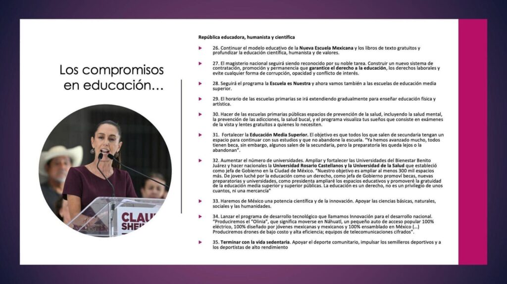 - Continuar el modelo educativo de la Nueva Escuela Mexicana y los libros de texto gratuitos y profundizar la educación científica, humanista y de valores.