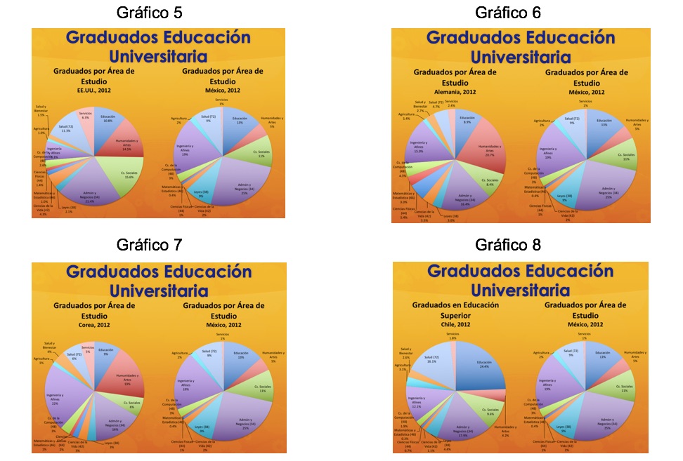 En relación con el mundo, México es un país inundado de ingenieros. Relativamente tiene muchos más profesionales egresado de esta disciplina que lo que parecería razonable esperar. México produce más de 3 veces la proporción de ingenieros que EE.UU, 1.3 veces los egresados en Alemania. México está ligeramente por debajo de Corea. Sin embargo, frente a otros países del área latinoamericana muy por encima (Véanse los gráficos 5 a 9 del apéndice gráfico).