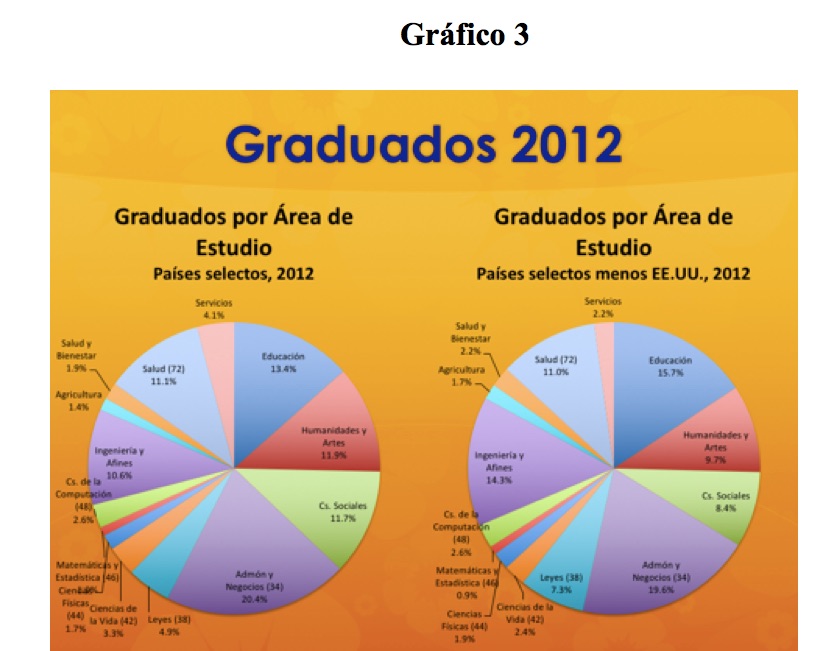 Frente al promedio de países seleccionados en la muestra podría plantearse la posibilidad de una sobresaturación de mercados profesionales en las Ingenierías, tanto como en Leyes. Una ligera saturación en Administración y Negocios. Pero, definitivamente, una sensible escasez de profesionales en Humanidades y Artes.