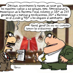 El articulista y académico Manuel Pérez Rocha remarcó que “las sesiones de las cámaras de Diputados y Senadores fueron una farsa, el interés del gobierno por escuchar a los maestros fue otra farsa, y la llamada reforma educativa es otra” haciendo referencia a su artículo “¿Y la reforma educativa cuándo?” Además hizo un diagrama que explica de manera puntual cómo los medios y el gobierno, comandados por Mexicanos Primero, siguiendo las tendencias de la derecha estadunidense, han logrado hacer ver a los profesores de nuestro país como los culpables de todas nuestras carencias: