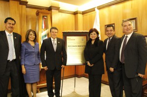 El presidente nacional del SNTE, Juan Díaz de la Torre, otorgó la placa distintiva a la directora del plantel, Irene Villafuerte Elizondo, quien ha logrado colocar a esta escuela pública como una de las mejores del mundo.