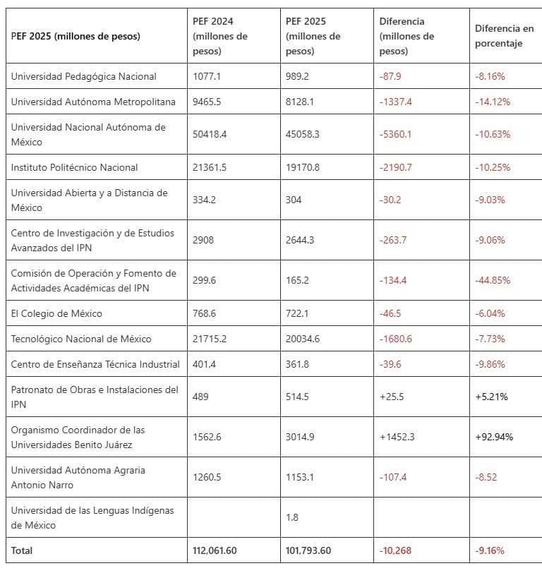 Con esta propuesta, las universidades más castigadas son: Universidad Autónoma Metropolitana (UAM) con -14.12%, Universidad Nacional Autónoma de México (UNAM) con -10.63%, la Universidad Pedagógica Nacional (UPN) con -8.16% y El Colegio de México con -6.04%.