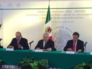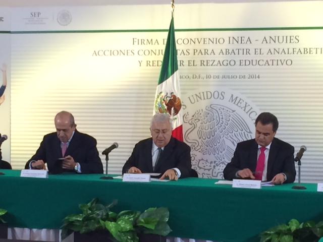 Reunidos en el salón Coro Alto de la SEP, el titular del INEA y de la ANUIES, Alfredo Llorento y Enrique Fernández, respectivamente, firmaron un convenio de colaboración para que los estudiantes universitarios participen en la campaña de alfabetización que buscará dotar de conocimientos para leer y escribir a 2.2 millones de mexicanos.