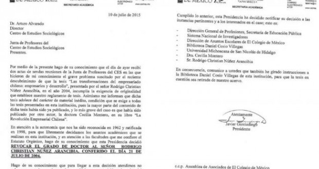 El Colmex retiró el grado de Doctor al sociólogo Rodrigo Christian Núñez Arancibia, por plagiar su tesis ‘Las transformaciones del empresariado chileno: empresarios y desarrollo’, presentada en el año 2004.