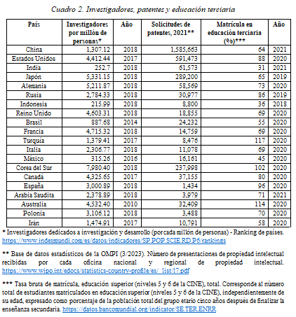 En cuanto a la masa crítica de investigadores, no es ningún secreto que ahí México igual registra un rezago importante, pues además de estar por debajo de Argentina, Brasil, Uruguay, entre otros, en el ámbito latinoamericano, si se considera el indicador del número de investigadores por cada mil de la población económicamente activa o de la población ocupada. Ahora bien, si se considera la posición de nuestro país en el seno de las 20 mayores economías, al considerar el dato de investigadores por cada millón de habitantes (ver cuadro 2), México se encuentra en el antepenúltimo lugar por la menor cantidad atrás de países como Indonesia e India respectivamente, y muy distante de países como Corea del Sur y España, e incluso Irán. En efecto, aumentar la masa crítica de investigadores es una medida necesaria para lograr una transformación productiva, económica y social, que lleve a mayores niveles de bienestar general.
