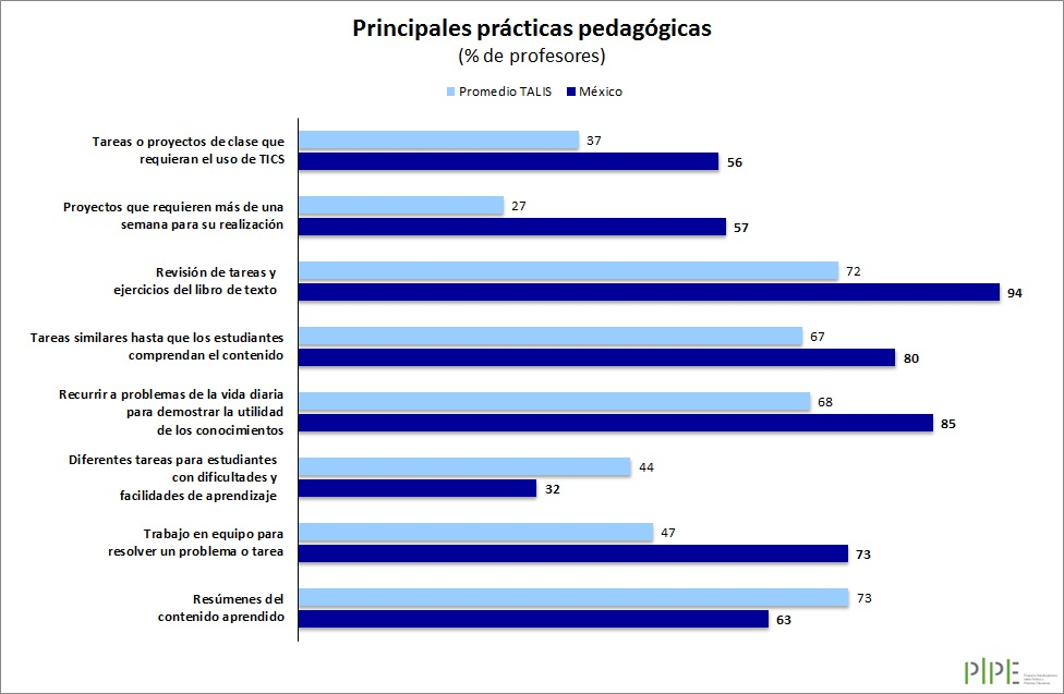 Las prácticas pedagógicas más usadas por los profesores mexicanos se enfocan en la revisión de ejercicios y tareas, el uso de problemas de la vida diaria y técnicas de trabajo en equipo; mientras que la práctica menos común se refiere a la diferenciación de las tareas para alumnos con facilidades de aprendizaje y alumnos con rezago.