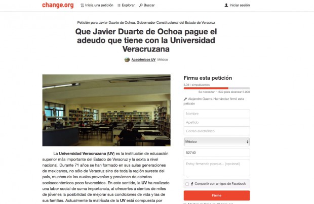 Académicos de la Universidad Veracruzana lanzaron una petición, a través de la plataforma change.org, para que Javier Duarte, gobernador del ...