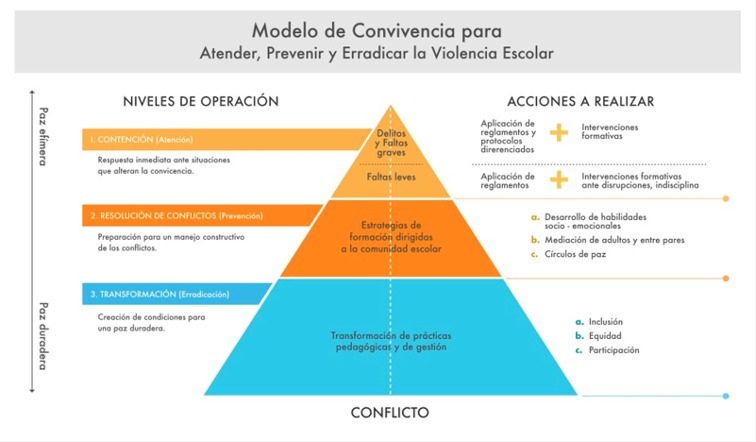 El Modelo se basa en un concepto de convivencia entendida como los procesos y resultados de los esfuerzos por construir una paz duradera entre los miembros de la comunidad escolar, a partir de prácticas pedagógicas y de gestión: inclusivas, equitativas y participativas que aborden de manera constructiva el conflicto.