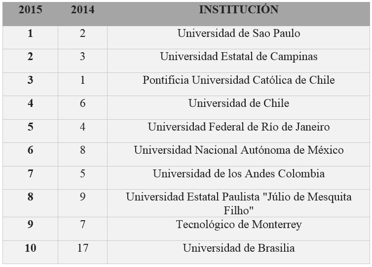 Según el estudio QS University Rankings: América Latina de Quacquarelli Symonds, la Universidad Nacional Autónoma de México, obtuvo el sexto puesto con una calificación de 94.9, de entre las mejores universidades de la región, escalando dos lugares en comparación con 2014.