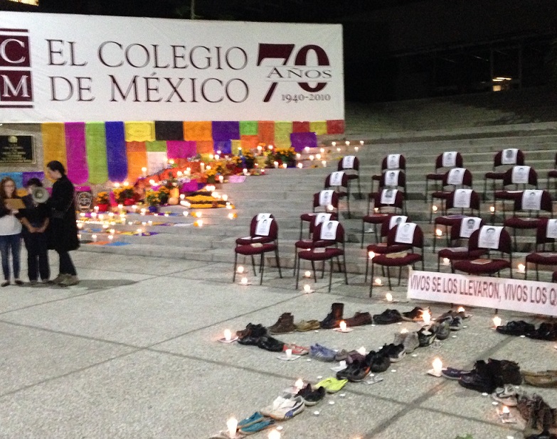 El último evento fue pasar lista por los normalistas desaparecidos, en el que por cada nombre se respondió con un alarido colectivo: ¡ausente! De manera solemne se guardó silencio, el cual se rompió por un estruendoso aplauso de los presentes al final. Después, se escuchó de pronto una voz colectiva que decía: “lucha, crítica y ciencia, el Colmex, el Colmex, generando resistencia”. Porra creada por lo estudiantes que participaron el día que marcharon alrededor de 90 alumnos junto con 7 profesores para exigir justicia.